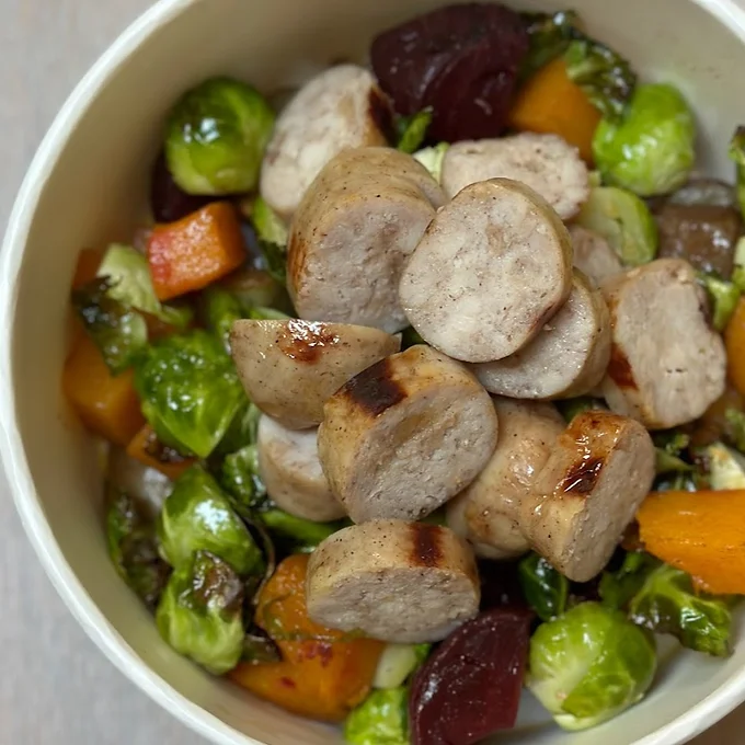 Savory apple chicken sausage served over a hearty mix of roasted Brussels sprouts, butternut squash, and potatoes. A flavorful, wholesome meal thatโs perfectly seasoned and full of cozy fall comfort. ๐๐ Individual Serving