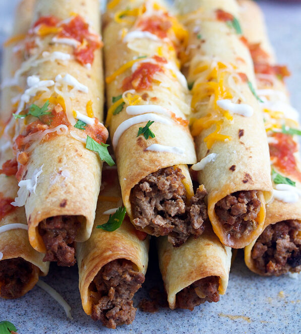 Baked tortillas rolled with beef taco filling and cheese. 15 to an order.