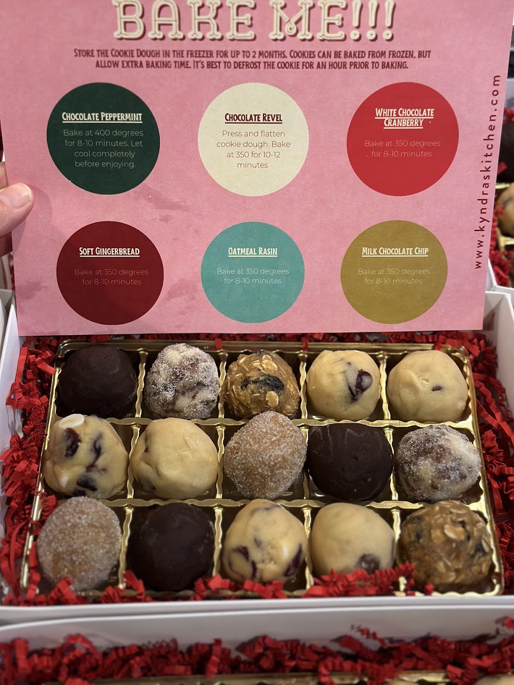 Our Cookie Dough Boxes comes with 15 balls of cookie dough (6 different kinds), ready to be baked in an oven or toaster oven. You can bake all 15 at once, or one at a time…your choice! And as long as you store the box in the refrigerator or freezer, they will last well past the holiday season!