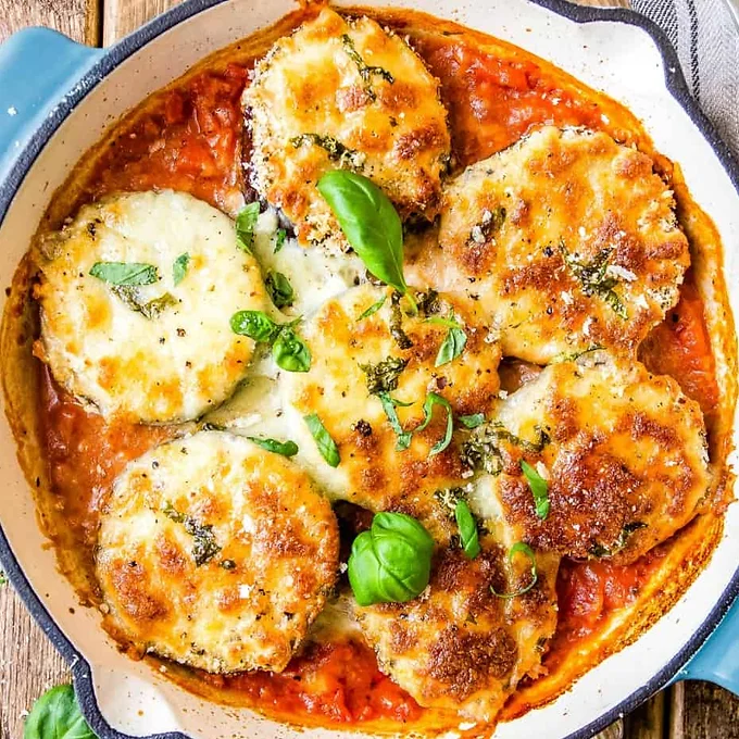 Tender slices of breaded eggplant, baked until golden and layered with rich marinara, melted mozzarella, and parmesan cheese, served on top of pasta. Finished with fresh basil and served hot for the perfect Italian comfort meal.