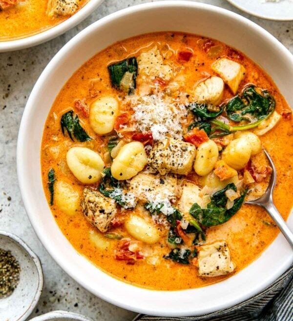 A rich and creamy soup filled with tender chicken, juicy tomatoes, pesto, fresh spinach, and pillowy potato gnocchi, finished with cream and Parmesan for a velvety-smooth texture.
